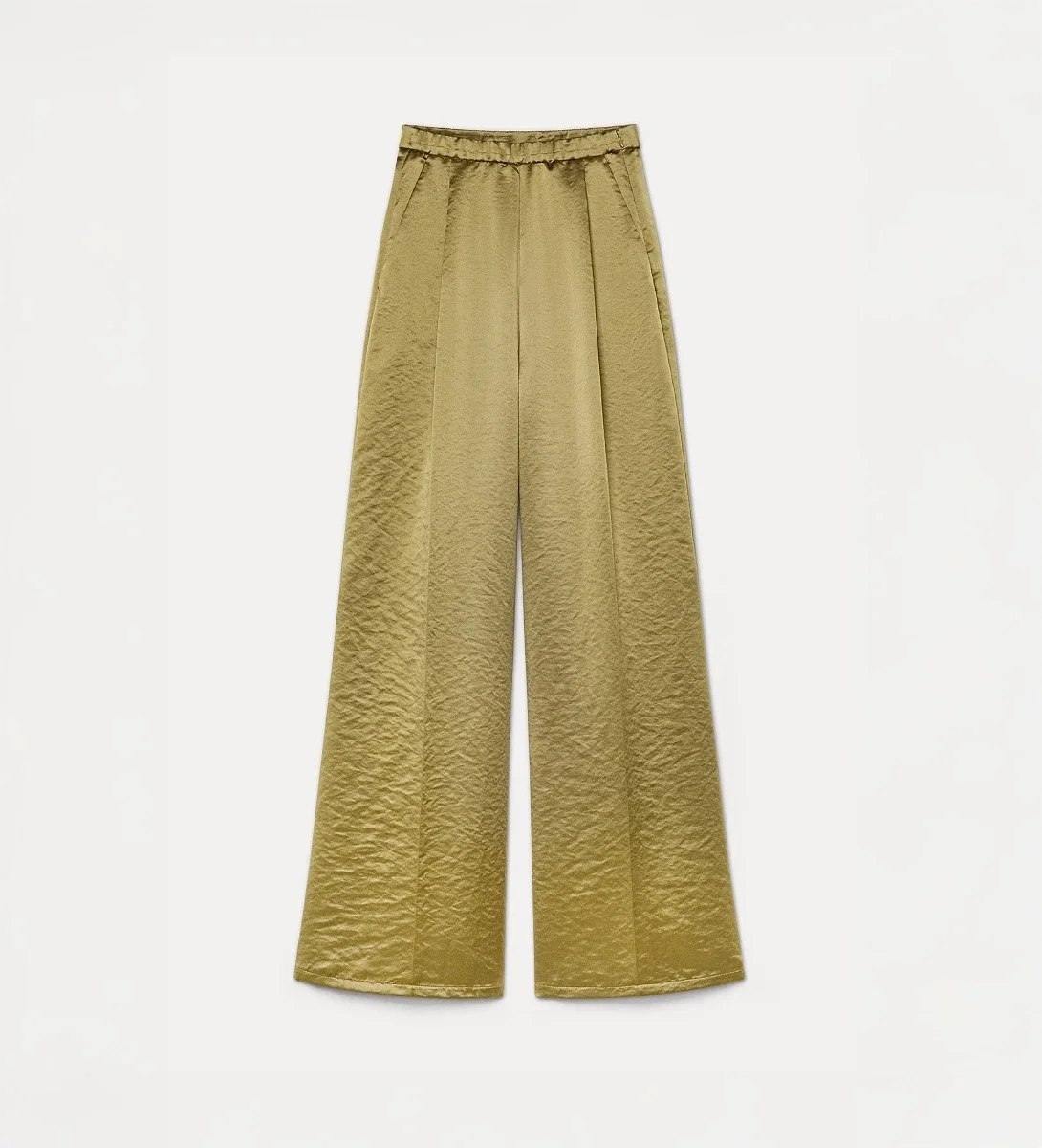 pantalon palazzo en duchesse au toucher consistant et riche, doté d'une taille entièrement élastique pour un confort discret. les jambes larges sont définies par des doubles pinces et un pli repassé, qui en accentuent la fluidité. les poches italiennes et le passepoil à l'arrière complètent ce pantalon palazzo élégant, au volume maîtrisé et au tissu légèrement mouvant au toucher.
