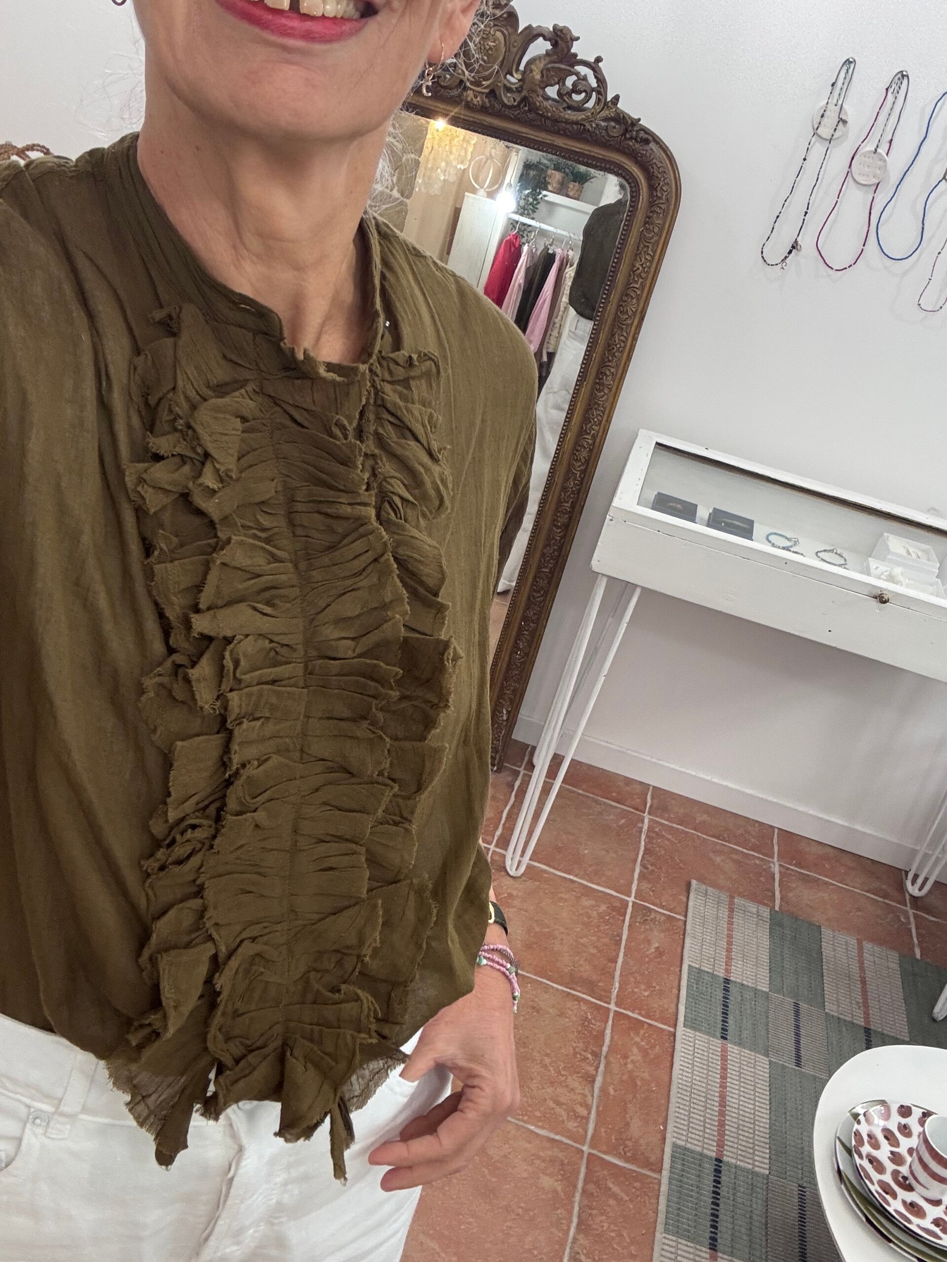 Blouse en coton kaki Coupe droite et fluide Col officierManches trois quartsFermeture boutonnée sous le volant